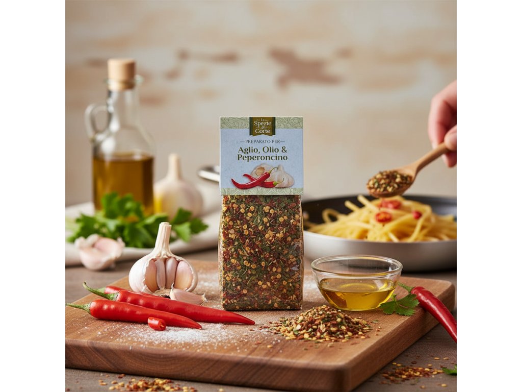 Směs Aglio, Olio & Peperoncino je sušená kořenicí směs určená k jednoduché přípravě klasických italských špaget aglio, olio e peperoncino nebo pro zvýraznění chuti dalších pokrmů. Základem složení jsou chilli papričky, sůl, petržel a česnek. Směs je vyrobena z přírodních surovin bez přidaných konzervantů a aditiv. Typická je výrazná pikantní chuť díky použití drcených chilli papriček a česneku, zároveň jemně voní po petrželi. Pro přípravu stačí směs krátce zarestovat na olivovém oleji a poté smíchat s uvařenými těstovinami. Produkt je vhodný pro milovníky výrazných a autentických chutí italské kuchyně, ocení ho vegetariáni i osoby s bezlepkovou dietou. Praktické balení usnadňuje rychlou přípravu doma i na cestách, každý si může doladit výslednou pikantnost podle vlastní preference.